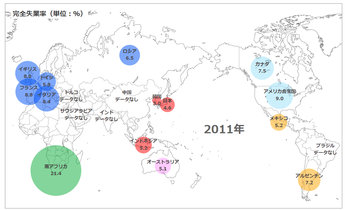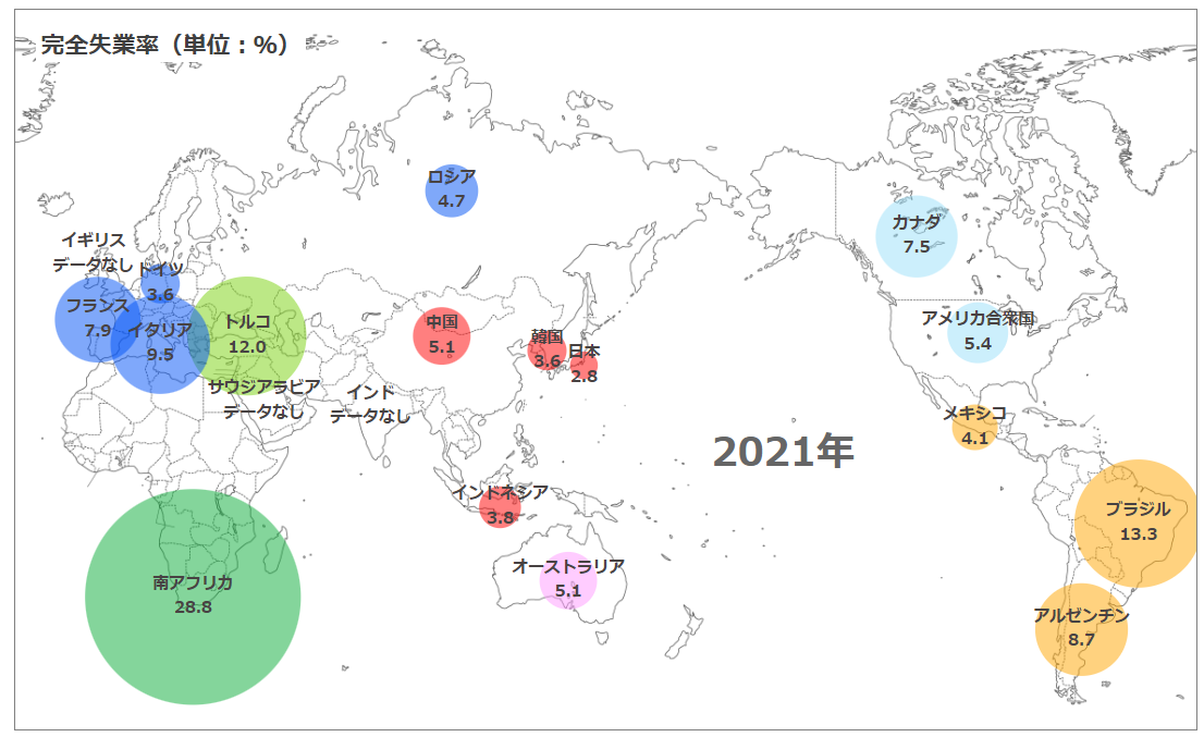 下記地図はILOSTATSデータを視覚的にわかりやすく加工した、統計ダッシュボードからの引用で、2021年と2011年の主要国の完全失業率を表しています。