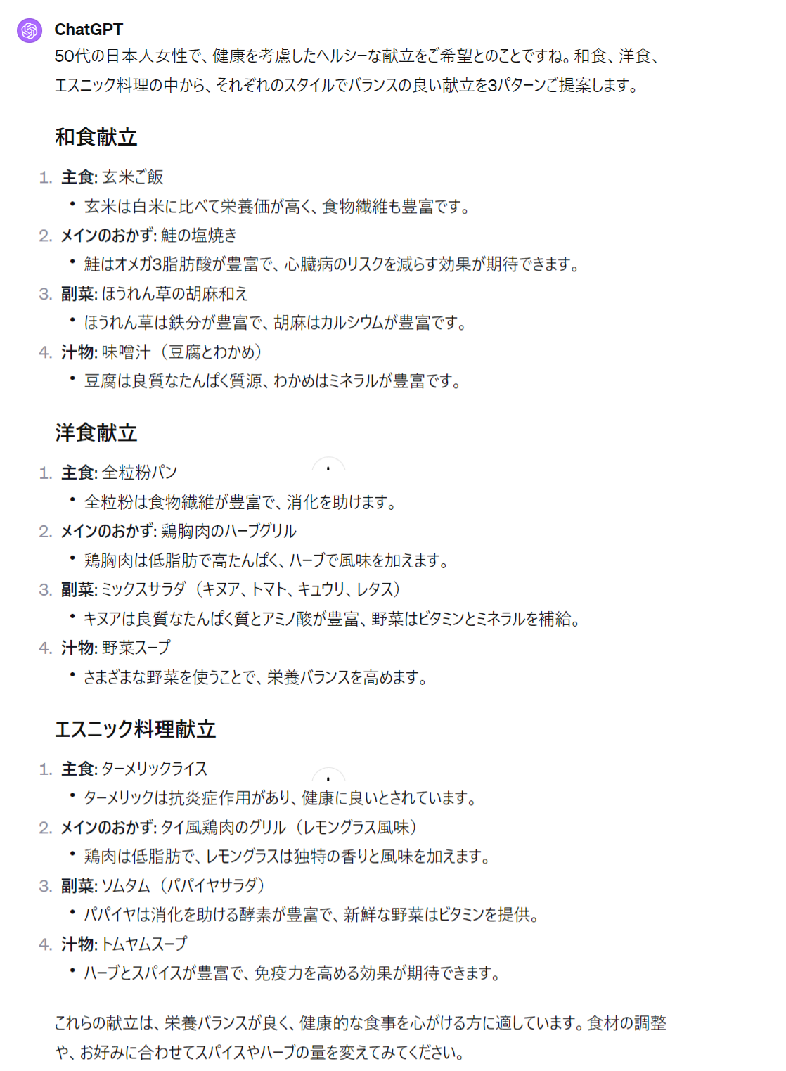 など、「考慮すべき範囲を明確に指定している」ということです。この質問に対し、得られた回答は以下となります(注:こちらは有料版の回答です)。タイ料理は結構作るの大変そうですが、他は現実的な献立だと思いました。