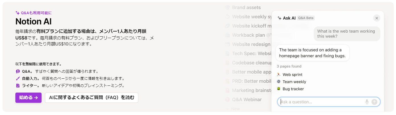 また、無料版・有料版ともにAI機能を追加することが可能です。無料版に追加する場合には月額10米ドルとなります(月単位で利用可能)。