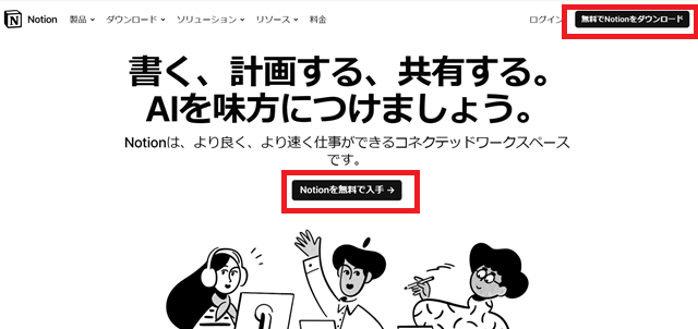 Notionの公式ウェブサイトにアクセスし、画面真ん中の「Notionを無料で入手」あるいは右上の「無料でNotionをダウンロード」をクリックします(どちらをクリックしても飛ぶ先は同じです)。