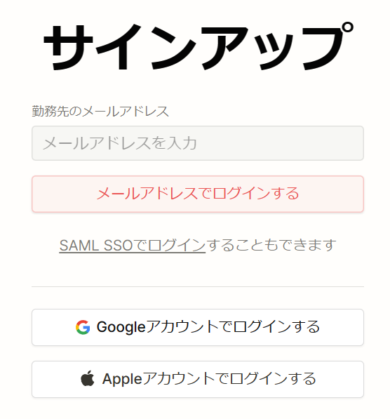Notionにログインする際、「勤務先のメールアドレス」とありますが、職場のチームで利用することが想定されているため、こう書かれています。個人としてNotionを利用する際はGmailなどの個人メールアドレスを利用してくださいね。「SAML SSO」も職場でNotionを利用するためのものですので、個人利用の場合は無視してください。