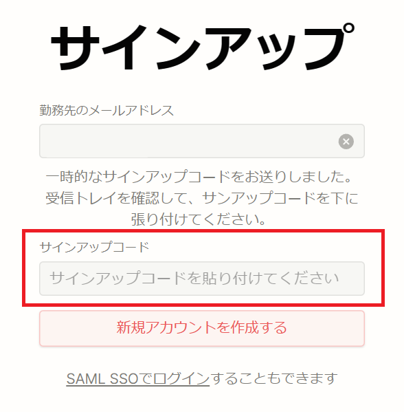 メールアドレスを入力し、「サインアップ」をクリック。メールで「サインアップコード」が送られてきますので、同じ画面の「サインアップコード」欄に入力してアカウントを有効化します。