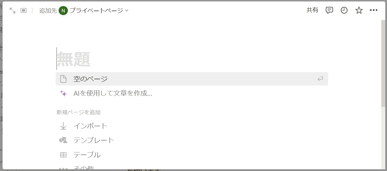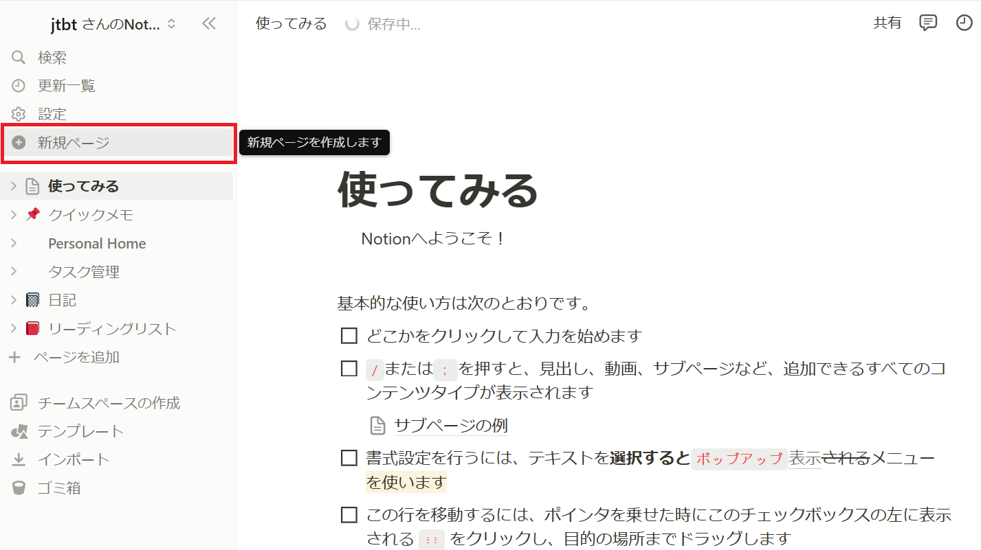 Notionはページベースで情報を管理します。左メニューの「新規ページ」をクリックすると、新規ページが作成できます。